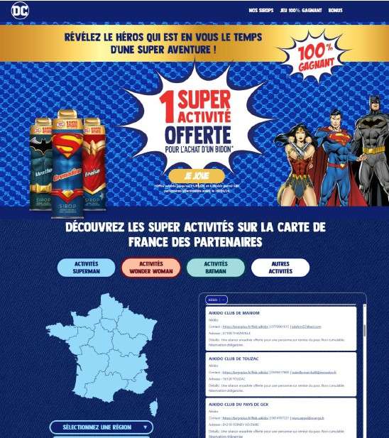 En achetant une bouteille de sirop dans une enseigne de distribution (Auchan, Leclerc, Carrefour ...) le consommateur a la possibilité d’obtenir 2 cours d’essai gratuits dans un club de son choix. Muni de son ticket de caisse, il accède au site de l’opération, sélectionne une activité sportive et le club de son choix dans la ville qu’il a sélectionnée. Il obtient ainsi un Pass qui lui permet de venir faire 2 cours d’essai dans le club choisi.