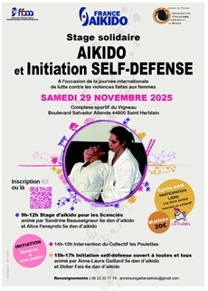 A l'occasion de la Journée Internationale des Luttes contre les violences faites aux femmes, retrouvez en téléchargement l'affiche d'un stage d'aïkido (le matin) suivi d'une initiation self défense (l'après-midi) - qui se déroulera le 29 Novembre 2025 à SAINT HERBLAIN (44)